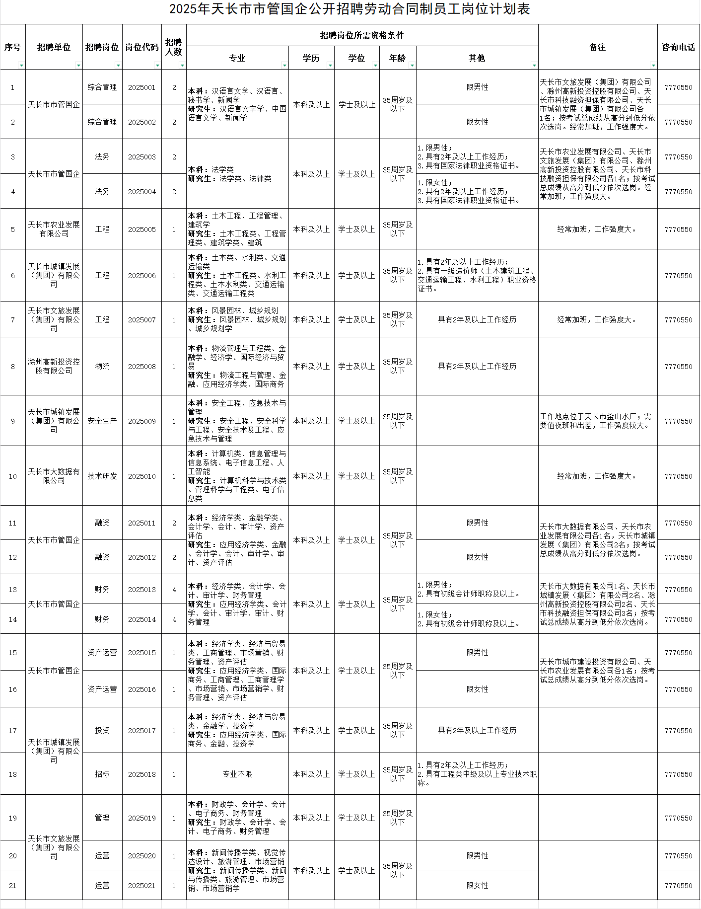 附件:2025年天长市市管国企公开招聘劳动合同制员工岗位计划表