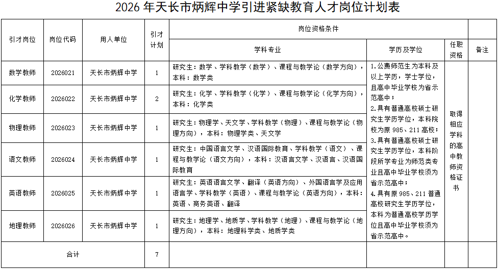 根据中共安徽省委组织部、省人力资源和社会保障厅《安徽省事业单位公开招聘人员暂行办法》(皖人社发〔2010〕78号)、安徽省人力资源和社会保障厅《关于加强全省基层专业技术人才队伍建设的实施意见》(皖人发〔2016〕36号)、《中共天长市委编办、市委组织部、市人社局和市财政局关于以理念创新为先导 统筹使用编制资源为高层次人才引进提供支持保障的意见(试行)》(天编办〔2020〕30号)和《中共天长市委、天长市人民政府办公室关于印发〈天长市引进紧缺教育人才激励暂行办法(修订)〉的通知》(天办〔2024〕41号)文件精神,经研究,同意2026年天长市炳辉中学公开引进7名紧缺教育人才。现将有关事项公告如下: