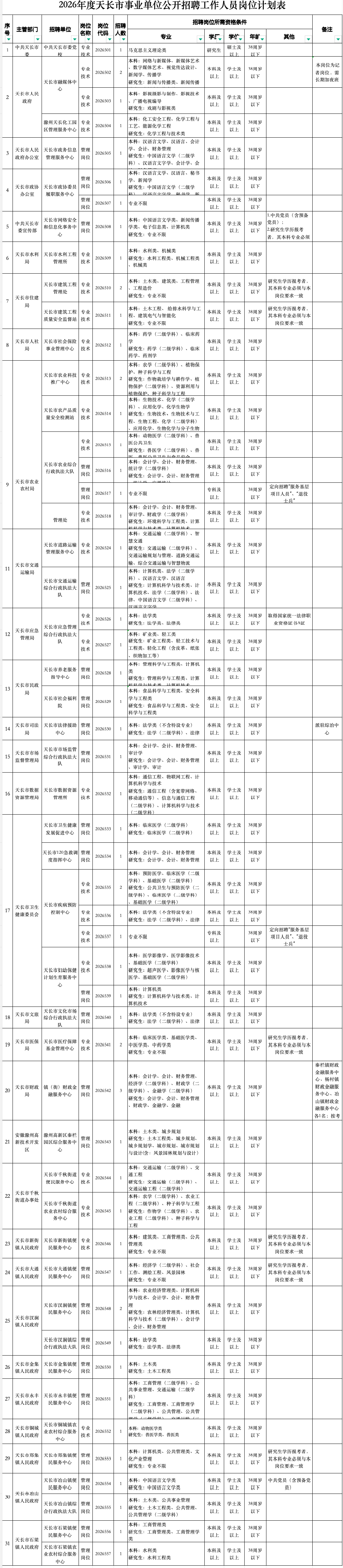2026年度天长市事业单位公开招聘工作人员65名,招聘计划(岗位)等信息于2月13日起同时在天长市人民政府网(https://www.tianchang.gov.cn/)、天长先锋网(https://www.tcxfw.gov.cn/)及相关媒体上统一发布。