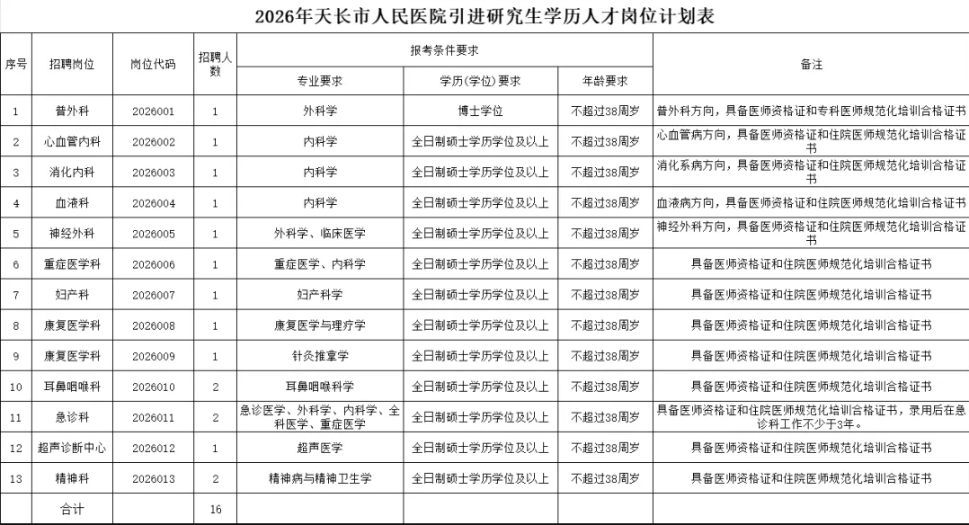 本次引进计划的具体岗位详见附件1:《2026年天长市人民医院引进研究生学历人才岗位计划表》。